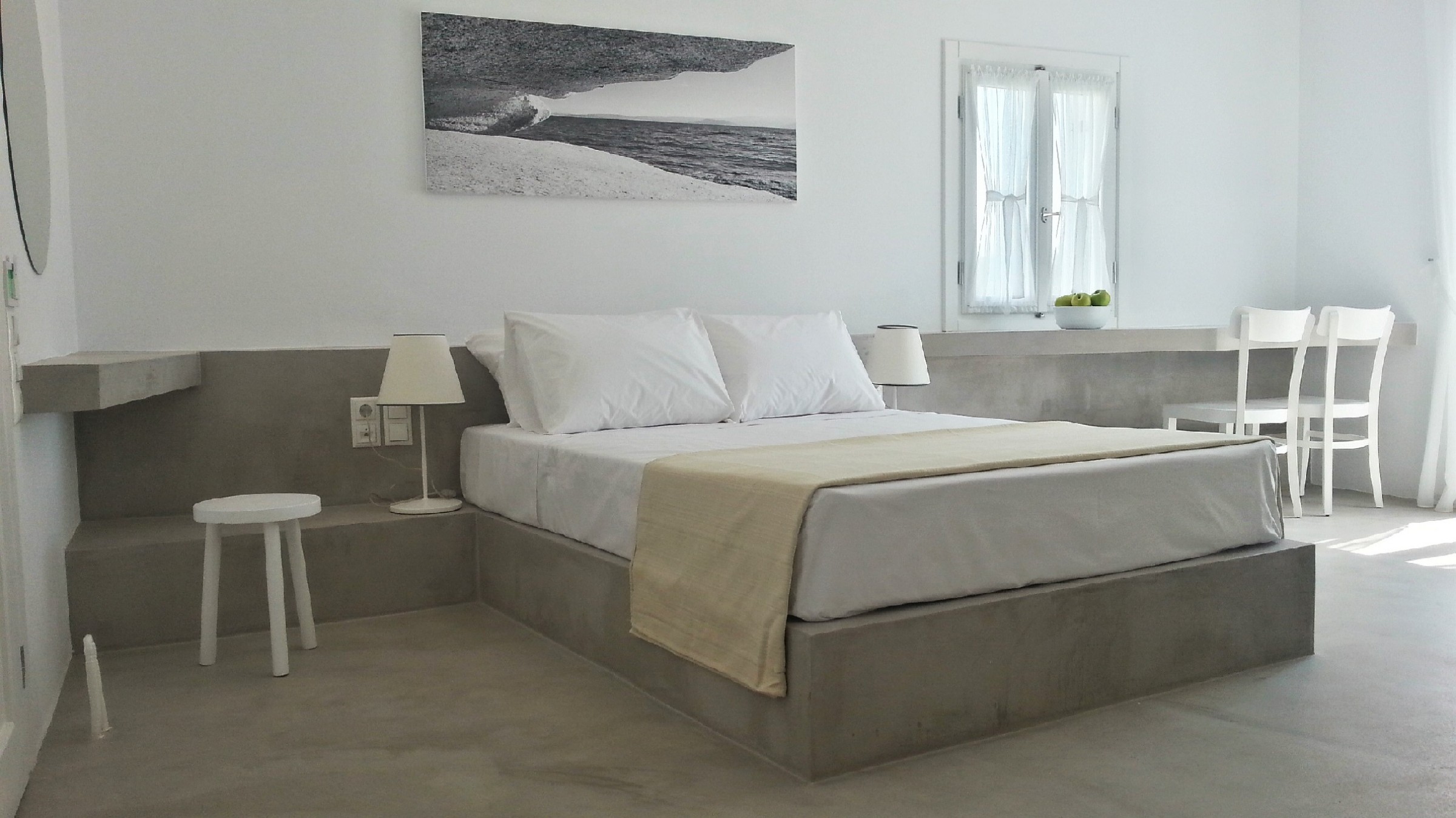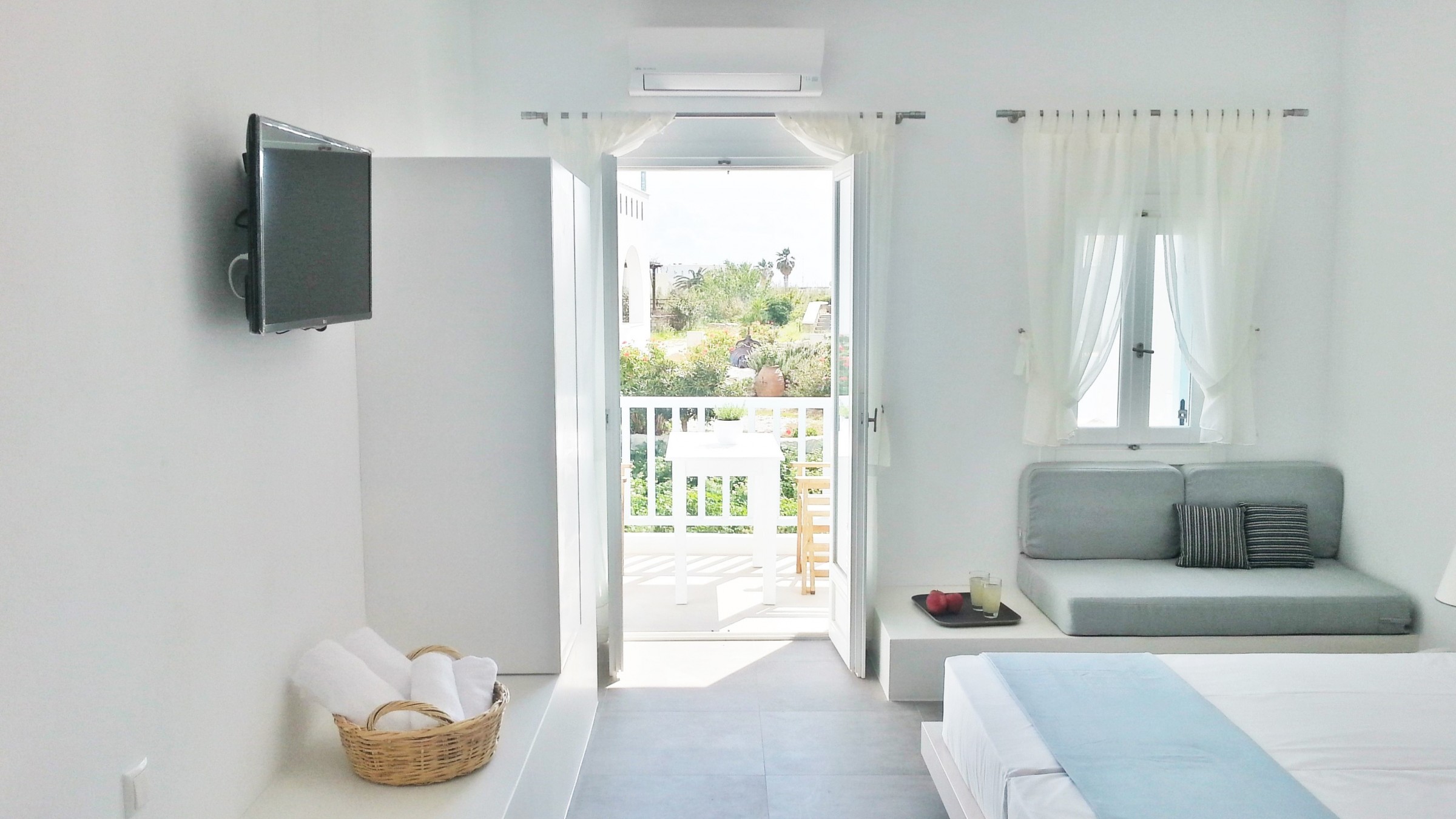 Ground floor room / 1 double bed / Sofa bed / Air-conditioning / Anatomic matresses / Free wifi / 32' full HD TV / Premium bedding / Stovetop / Soundproofed room / Fully equipped cupboards / Refrigerator / Phone / Hair dryer / In-room safe / Satellite Tv with greek and international channels / Electronic lock / Daily maid / Room service (limited hours) / Free toiletries / Shower / Free infant bed